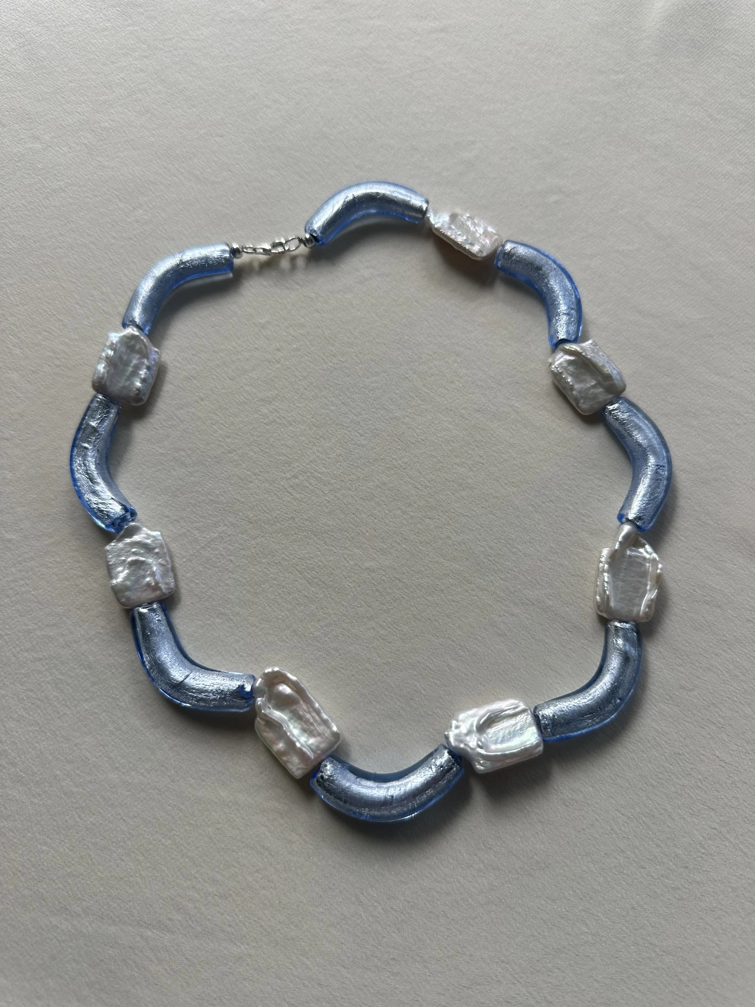 Silver leaf filled azure blue glass squiggle beads with handmade glass flowers and clear quartz beads, sterling silver lobster clasp, 43.5cms