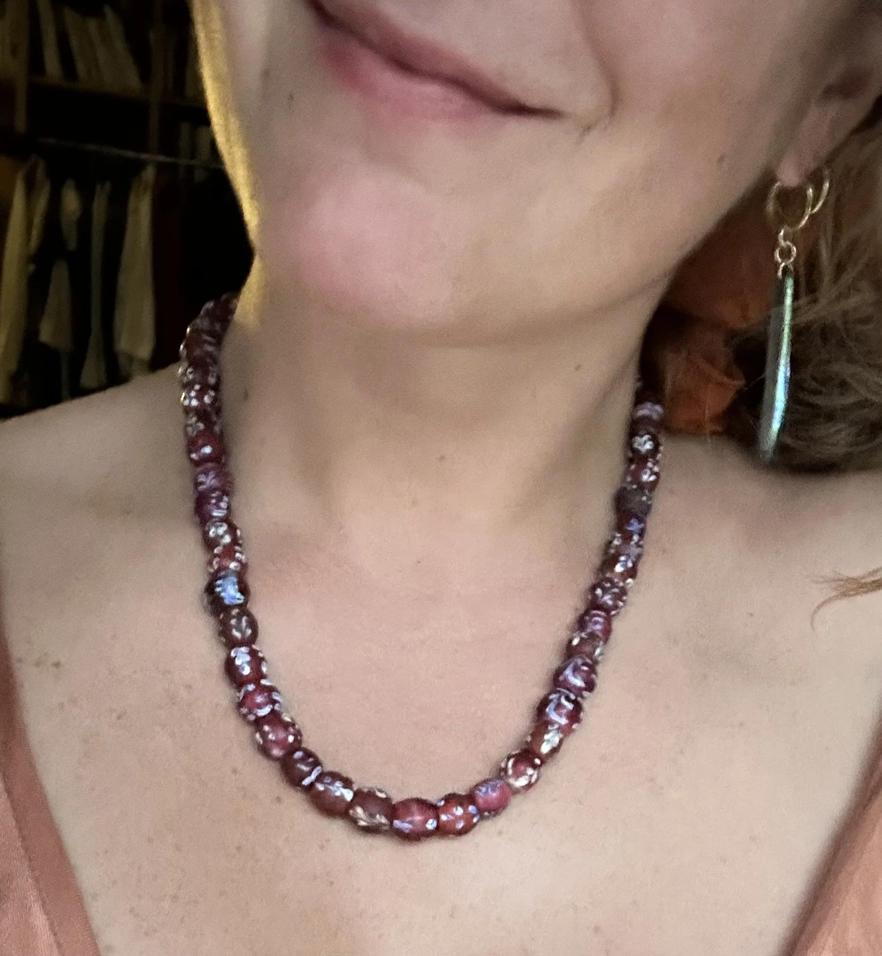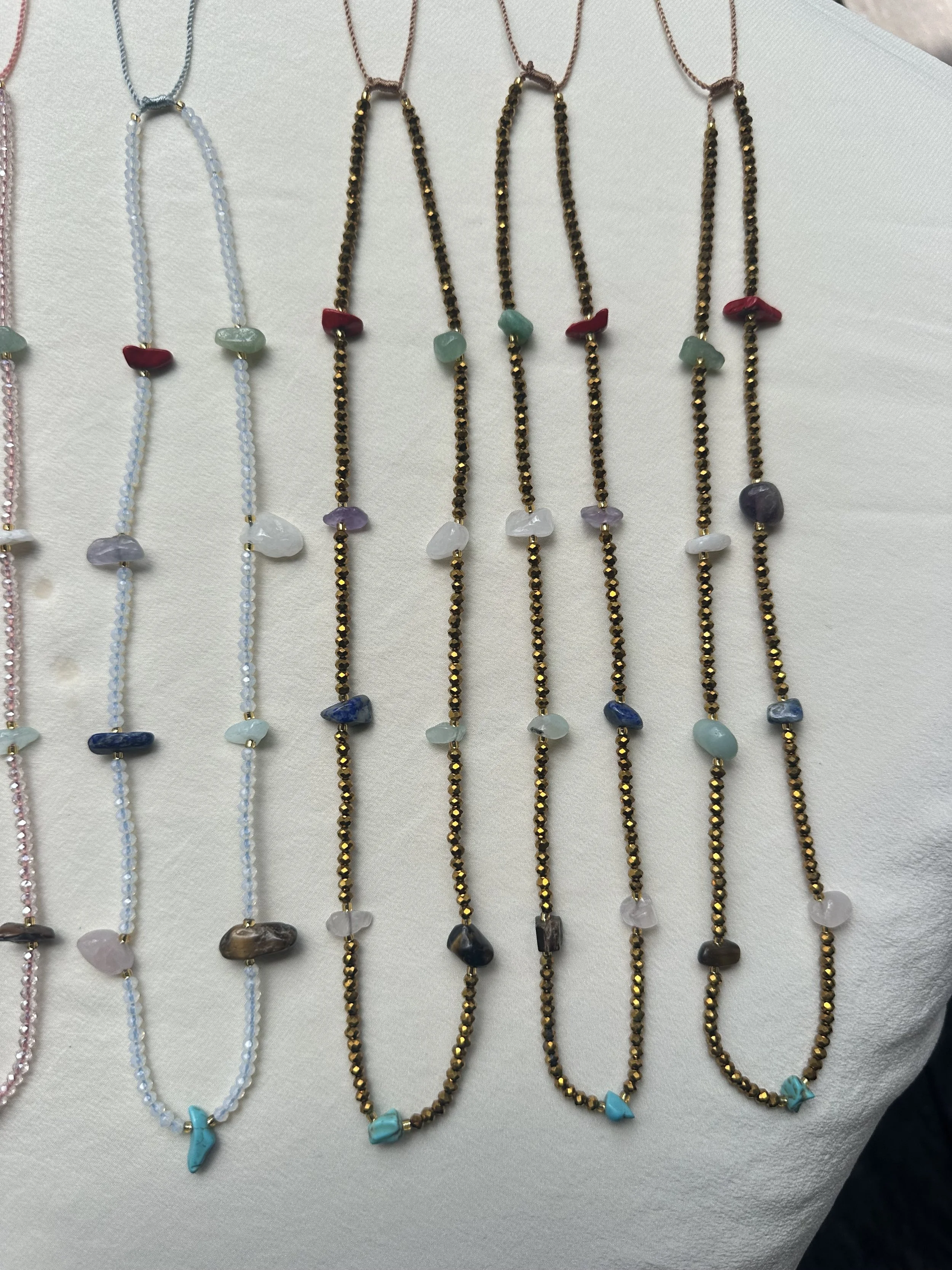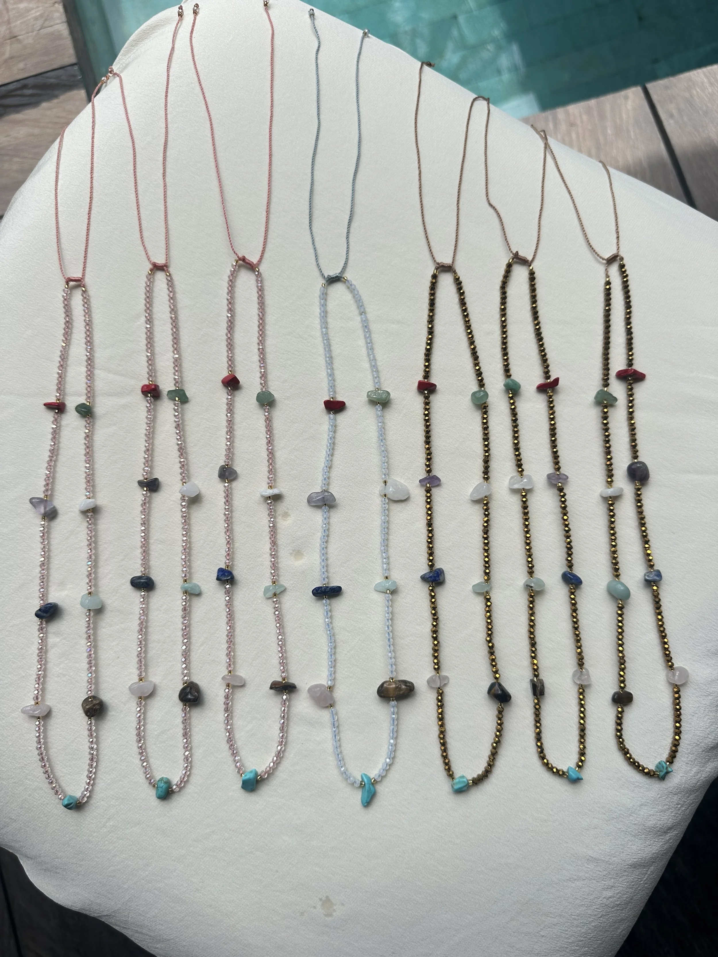Pink faux crystal and mixed gemstone (lapis lazuli, turquoise, coral, tigers eye, adventurine, amethyst, rose & white quartz) nugget necklace sourced in Bali, adjustable from loose choker to long necklace